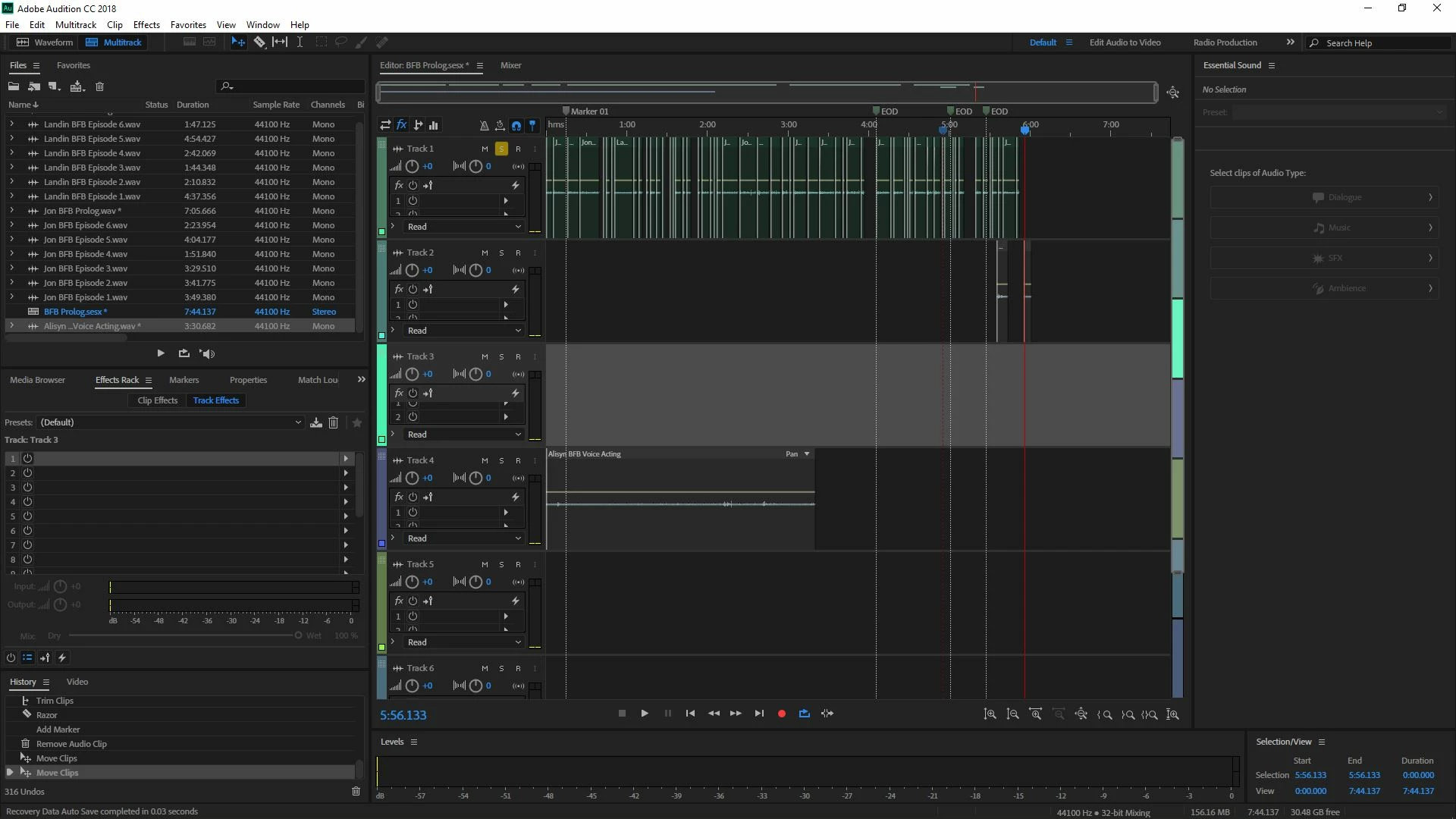 I know how to add effects in this program, infact for the voice overs I did, I EQ'd all the characters which is 3 voice actors, but theres 21 characters, so I need to put effects on each of the characters, but the problom is I just had one person do their lines for 1 episode (It is a 6 episode series each episode being from 3-6 minutes long) at a time, which means that all the differnet characters have similar voices, and I can't just simply apply a effect for episode 1 on 1 character, I have to manually go back and do something, so what I am trying to ask is their a way to select audio file in Multitrack Session, and simply just add effect only on the 1 audio file, Heres a screenshot of what it looked like after me putting all 3 of our voice overs together in order, this is for the prolog