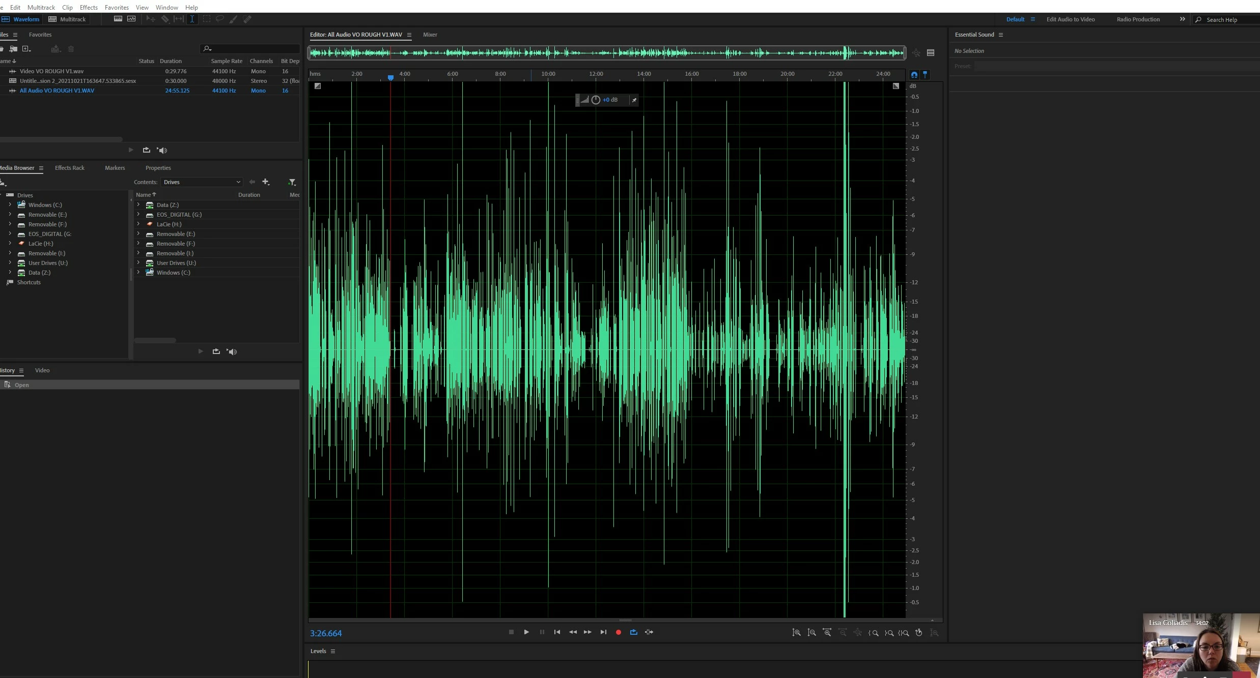 Help! Editing VO in Audition. The audio wave form is showing up, but audio won't play. I can't export the sound, can't copy the sound, can't do anything with it. There is only a small snippet of the 26minutes that plays. Anything I should be looking for? Screen shots attached.