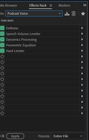 I was working with a voice recording.. Applied the Podcast Voice Effect stack 75%.. There is always a slider under the effects stack.. Works perfectly.