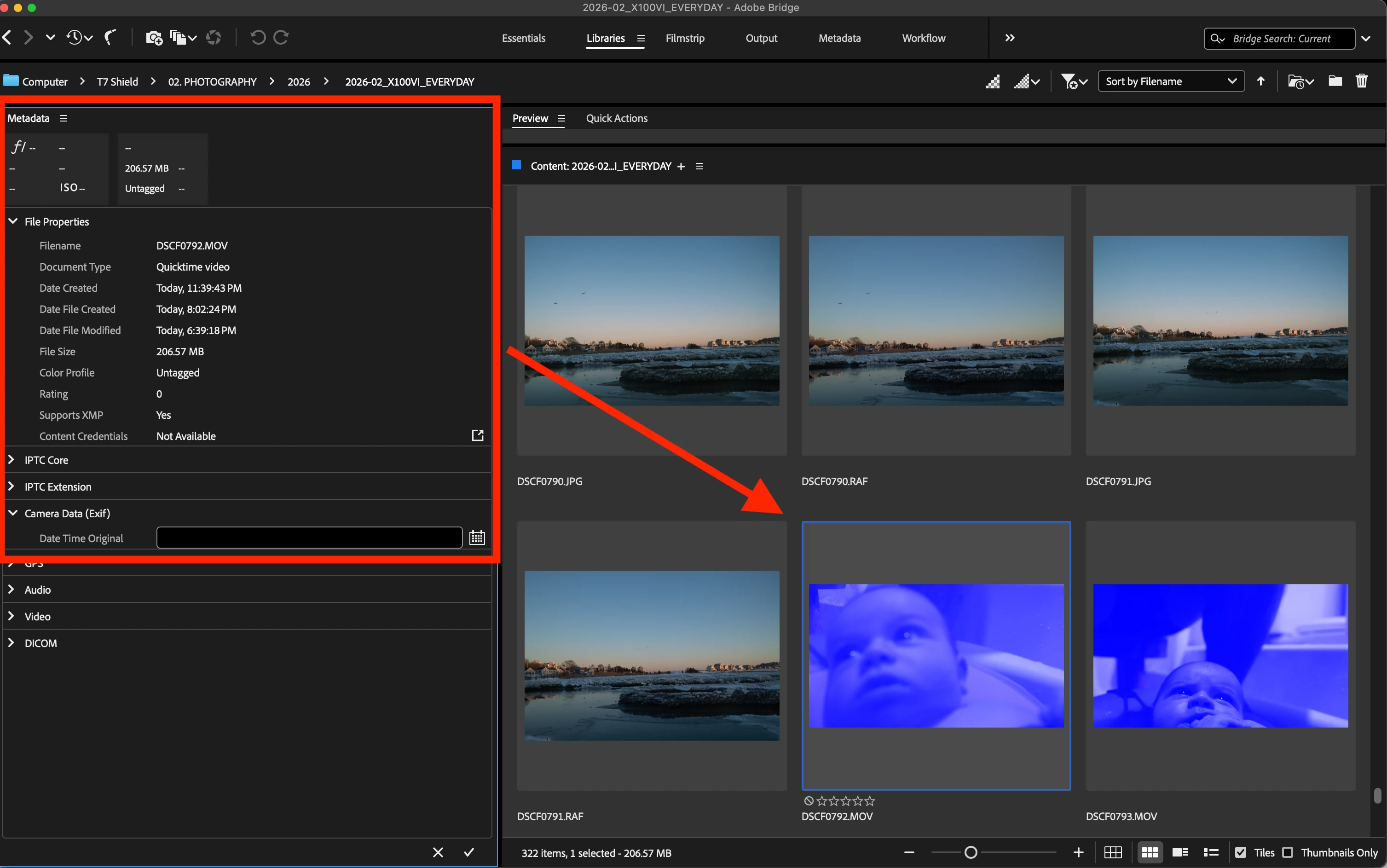 Just in case anyone is wondering (I’m talking to you, Adobe) this issue still persists. I’m attaching a few more detailed screenshots so maybe your team can “reproduce the issue on our end” with a little more luck. The first screenshot shows the blue thumbnail clips in library view, second one shows that Bridge captured ZERO Metadata or EXIF data from the video file, and third screenshot shows the file info, codec, camera shot with, etc. Aside from screen capturing my Terminal activity I can’t imagine what else you’d need to fix this simple but annoying glitch.