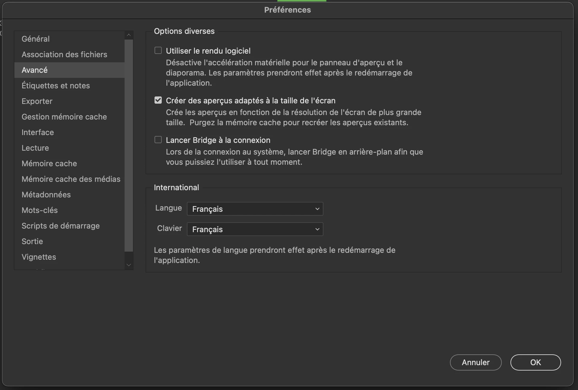 Voici les réglages Bridge 2023 :