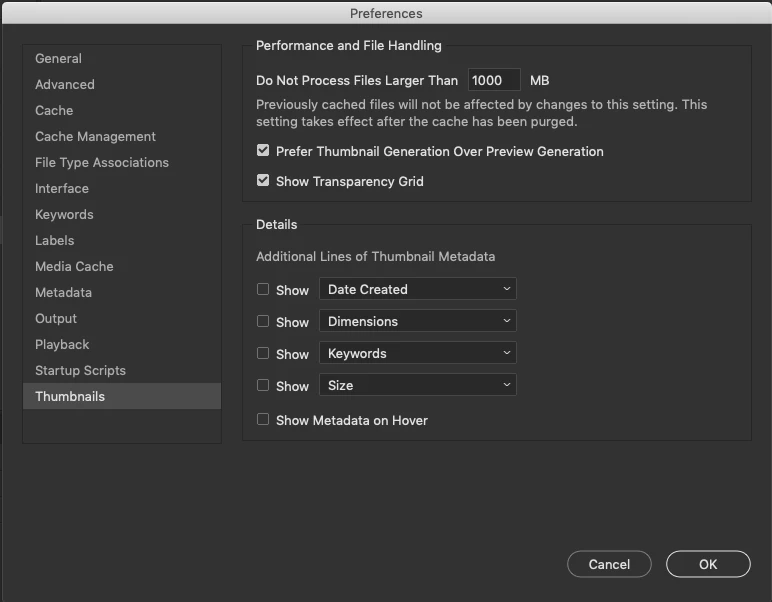Recently upgraded Bridge from 2018 to 2019 and can no longer see the lines of metadata underneath thumbnails (file type, size, date created etc.). If hover is clicked the info pops up but i don't want that! I want the information to live visibly under the thumbnails permanently just as it did in earlier versions. Yes, I've clicked off hover. What's going on? Is there a preference I need to set? Is this a glitch? I've cleared my cache, refreshed, quit, restarted....help!