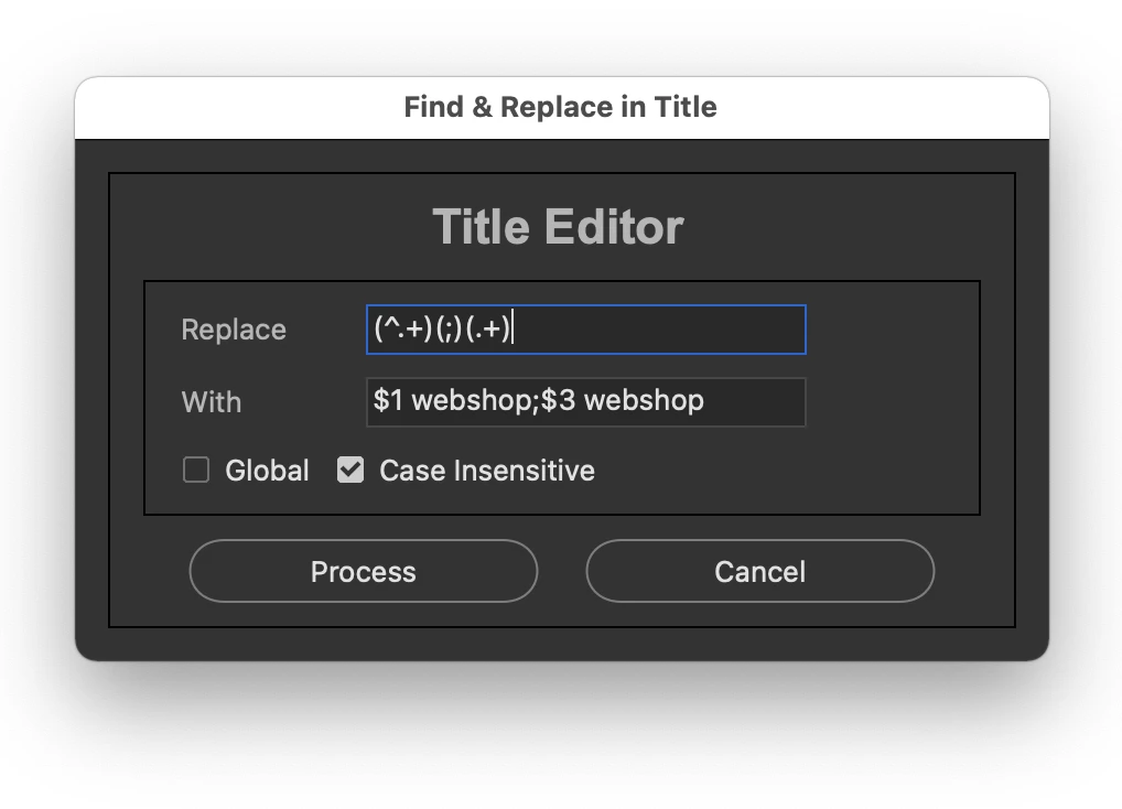 ReplaceTitle = new MenuElement("command", "Find and Replace in Title", "at the end of tools");