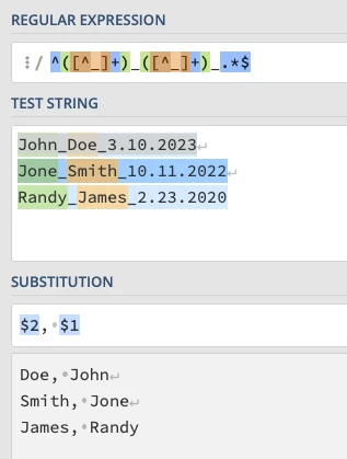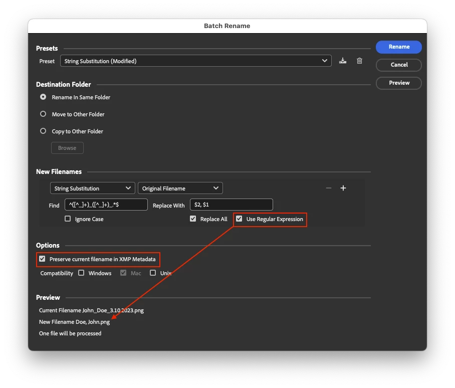So in other words, Keep the name of person but do last name first and first name last. is there a script or rule i can use to do this in the bath rename feature? Or can we do this useing Adobe Acrobate Pro?