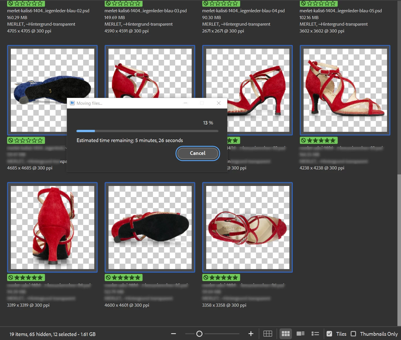 Accessed Move from the context menu with a preselection of 19 PSD files (1.6 GB). Each of the drives involved is a fast NVMe drive. The process should not take more than a few seconds. As seen, Bridge even crashed and needed to be killed from Task Manager (Win 10).