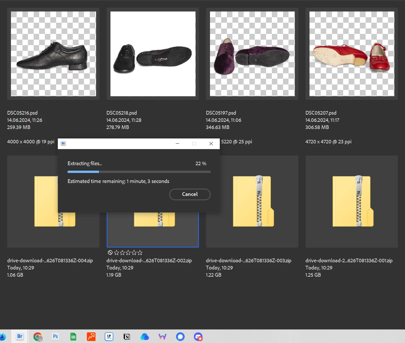 I tried unzipping several large archives at once. Bridge got stuck at 22%. I had to cancel and use other tools. Can't Bridge use multicore-enabled open-source Zip tools? My hardware / RAM can hardly be the bottleneck (64 GB).