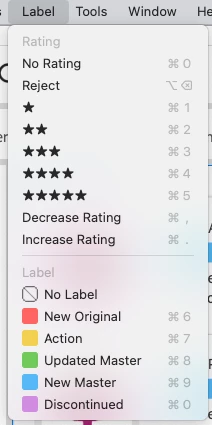 I added a shortcut for Purple label, command-0, the shortcut dialog shows this assigned and "no rating" still assigned to command-0 (num) which I assume is the number pad, I'm using a MacBook Pro 2019 and Apple BT keyboard and neither of them have a number pad. The Label menu shows command-0 for both operations.