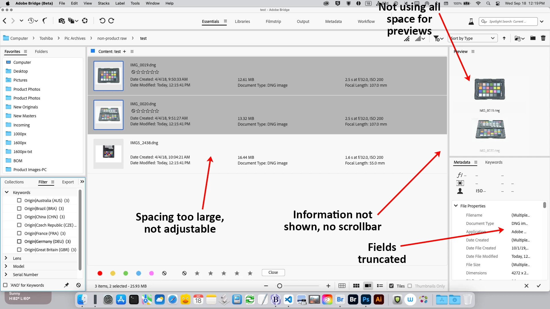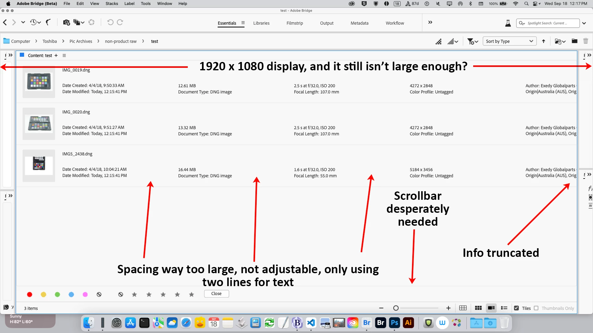 In Details View, metadata is truncated or hidden. There is no scrollbar, columns are both way too large and cannot be resized, and it renders the whole thing unusable.