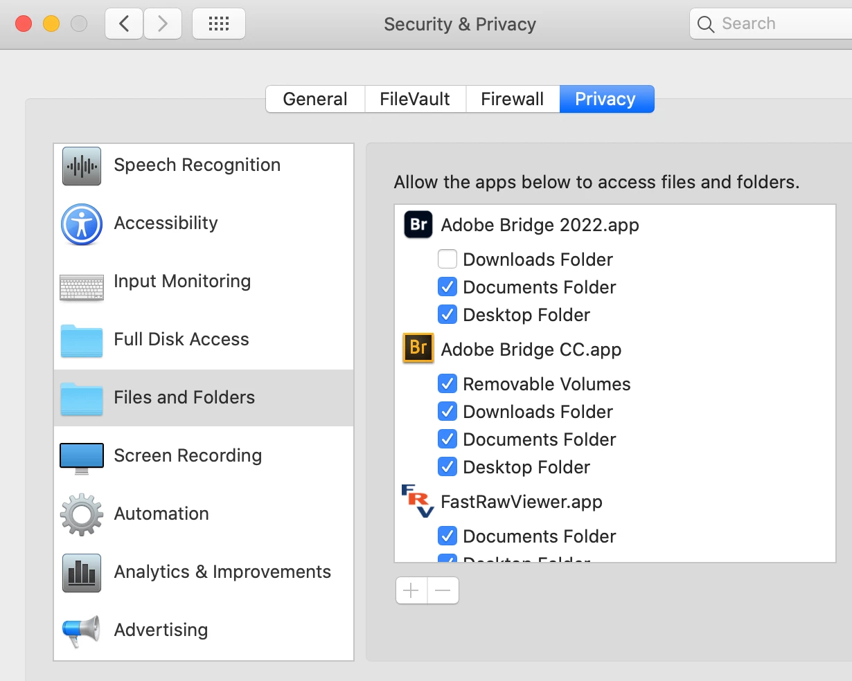 Have just upgraded to Bridge 2022 and can no longer access images on my external drive, where I keep all my photographs. I have gone to System Preferences - Security and Privacy - Files and Folders. Bridge 2022 has only three options available, Downloads Folder, Documents Folder and Desktop Folder. The previous version had an additional folder called Removable Volumes. Please advise