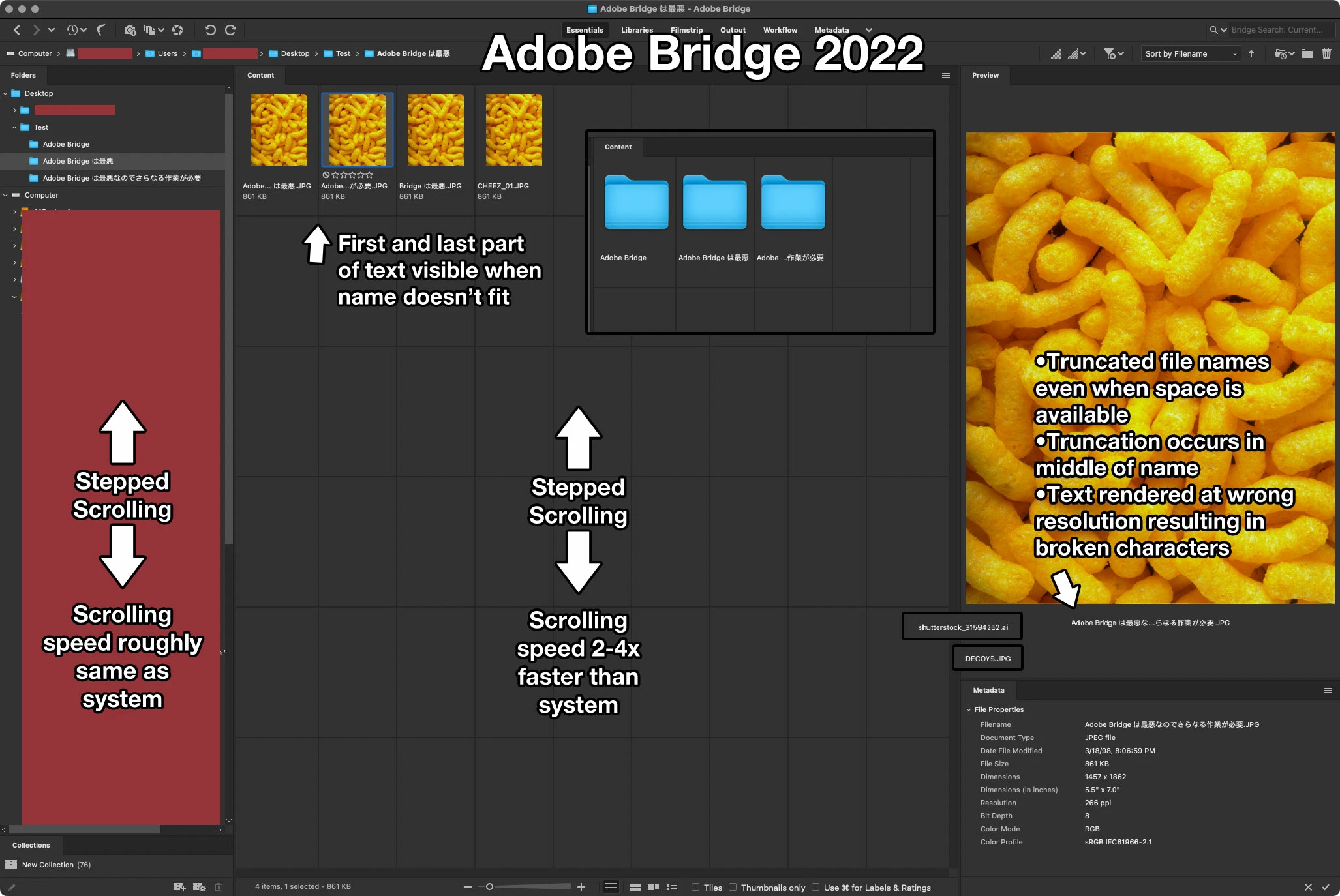 •Content Panel: For v14 file names in the content panel now get truncated to the point of uselessness. If the file name doesn’t fit in the tile space then you’re left with only the first character of the name. In v12 it would truncate the middle of the text so you could still see the most important parts of the file name.