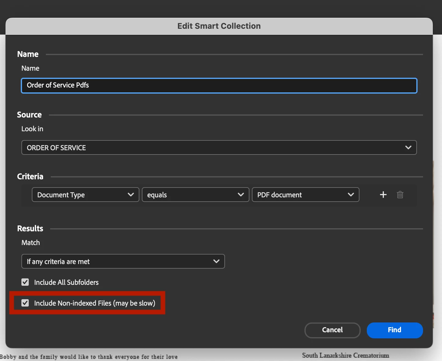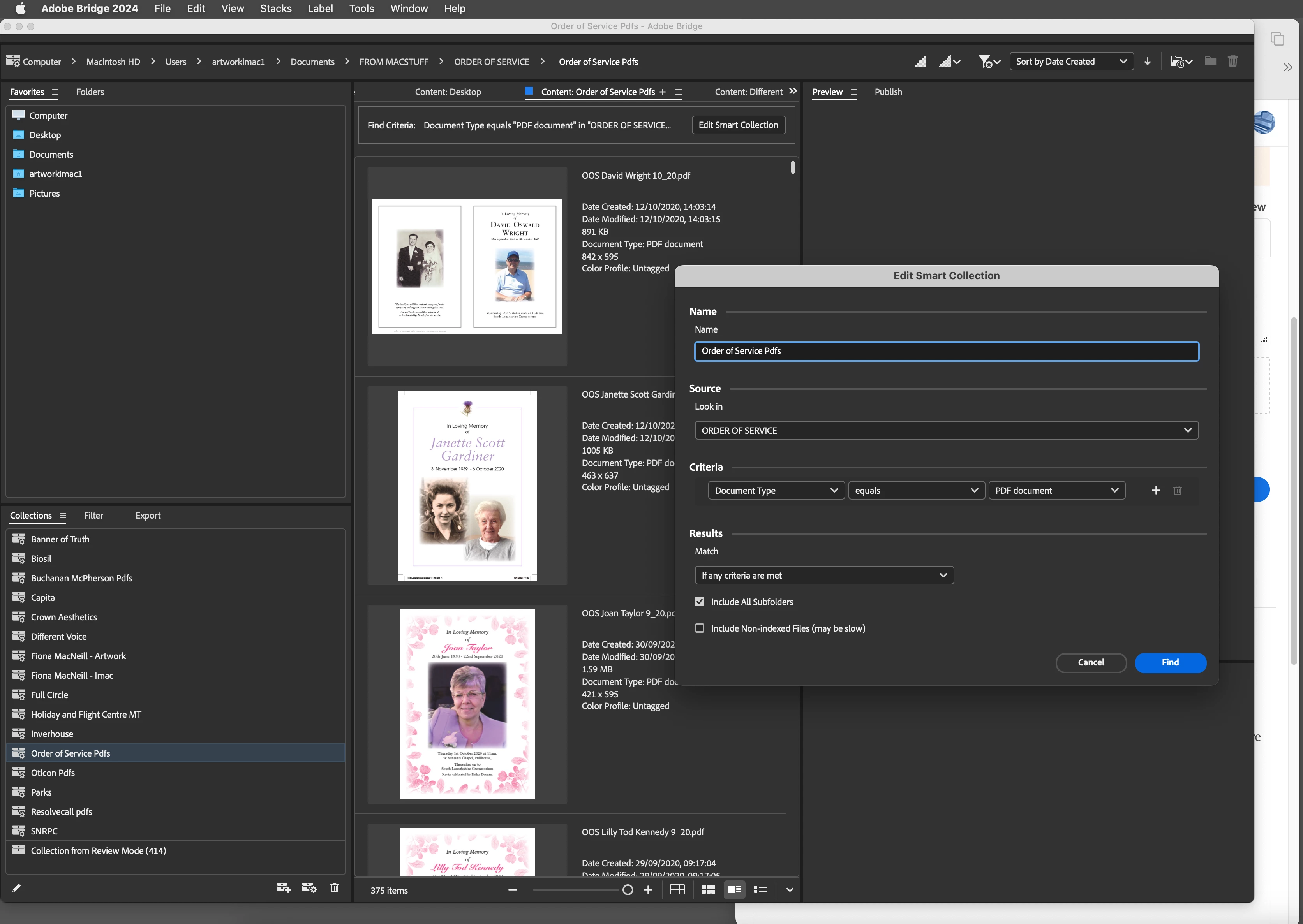 Hi, I have updated Bridge to the 2024 Version, Mac OS Ventura, however any Smart Collections I had do not work now. I have tried setting them up again, but it does not work. I am trying to find pdfs for each customer so I can refer to each job. This worked fine before the update. I have reset prefs/cache but this does not work.