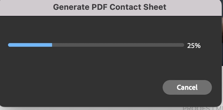 - While contacheet generation is executing, the progress bar starts at 25% and stays there the entire time. There is a message in same dialog with duration estimation of 1 second. This takes over 30 minutes!