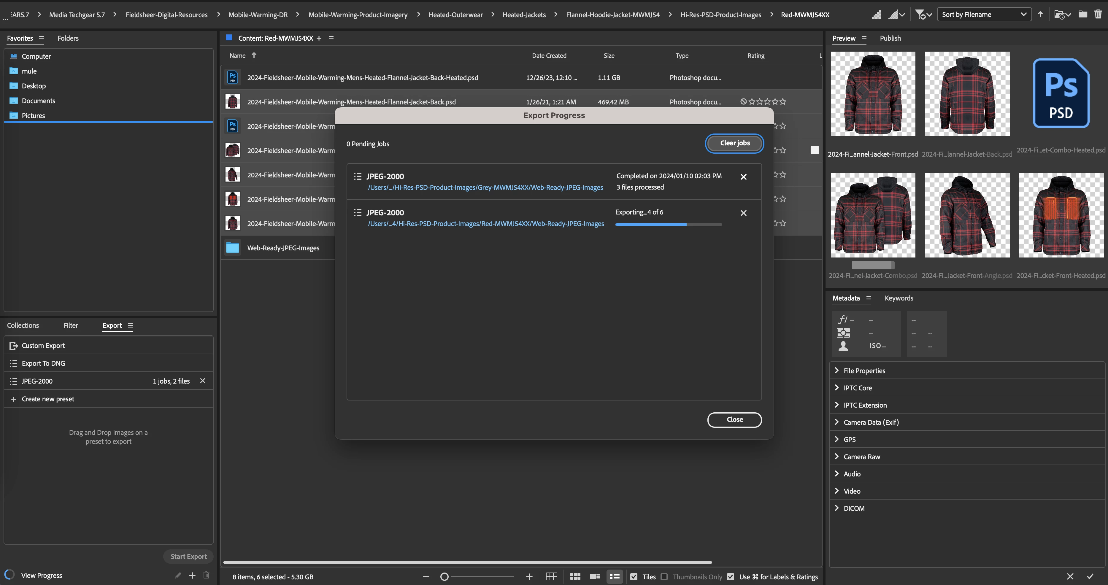 I do product photography and editing for an apparel company. I shoot my photos on mannequins and edit multiple angles of the garments in photoshop and save each angle as an individual PSD file. For years I have been using Bridge's batch export process to convert my final PSD files into various size of PNG and JPEG codecs for web use and distribution to my sales team. However I've recently been having issues with the batch export process. For what ever reason my batches will export one or two of the files then suddenly freeze up and never complete the rest of the process. I have to then Force Quit the application to close it down when this happens. This issue is adding hours onto my workflow process as I have to then run actions through Photoshop to export each group of garment angles and I really would like to go back to my old process of using the Bridge batch export.