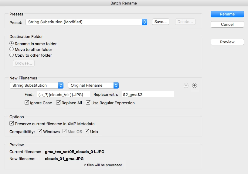 I'm relatively new to Regular Expressions and String Substitution, but with a little research and a cheat sheet, I got MOST of what I need, but am still stuck on one point. I can't seem to get the "_gma" added at the END of the file but BEFORE the .jpg extension if using regular expressions to remove the first part (gma_tex_set05_). I found multiple ways to remove "gma_tex_set05_", including: