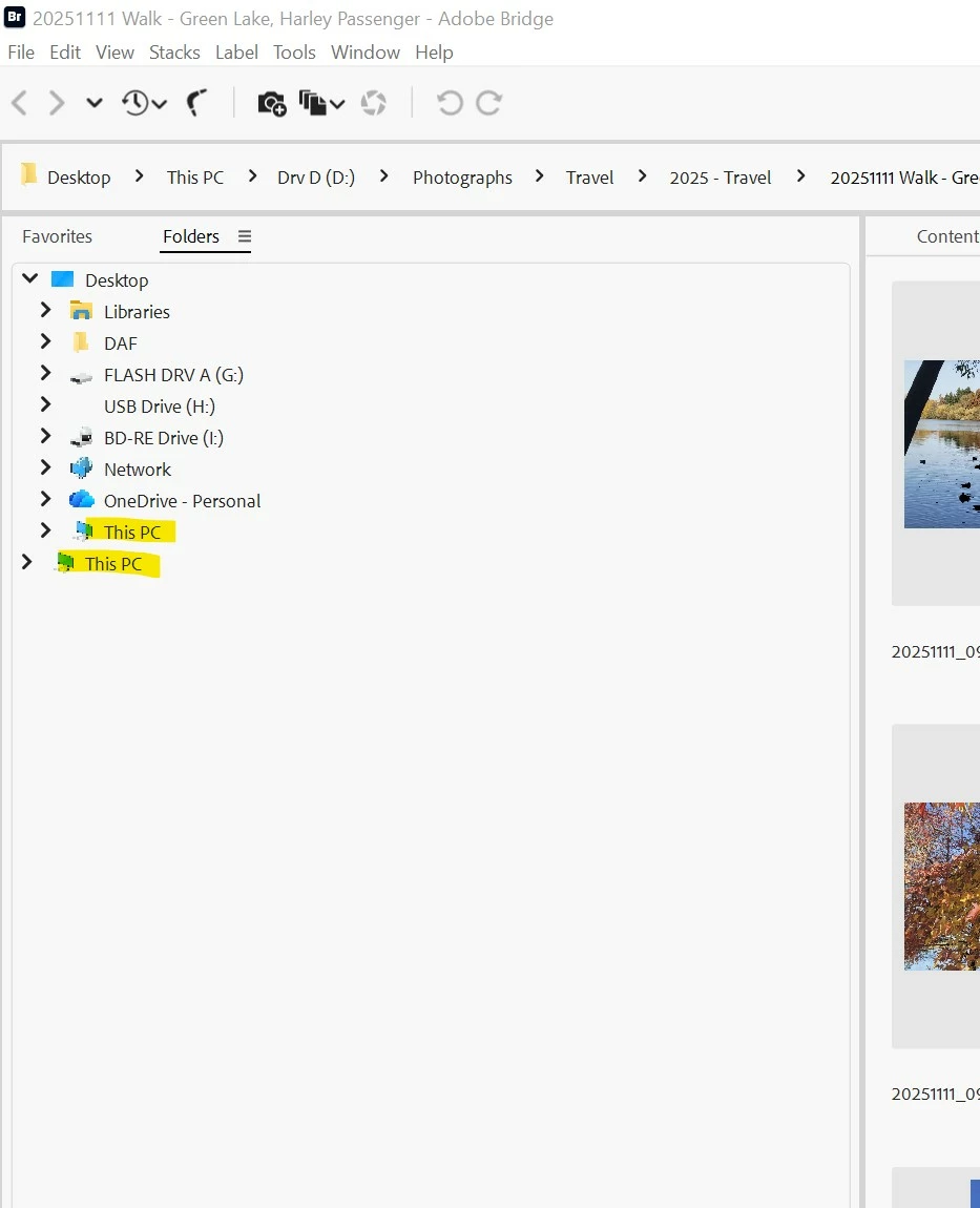 In the Folders section of Bridge, "This PC" and subsequent folders are listed twice; duplicated. I'm using the current version of Bridge and have reinstalled twice, to no avail. Microsoft File Explorer and other like apps work Ok, no duplicated trees.