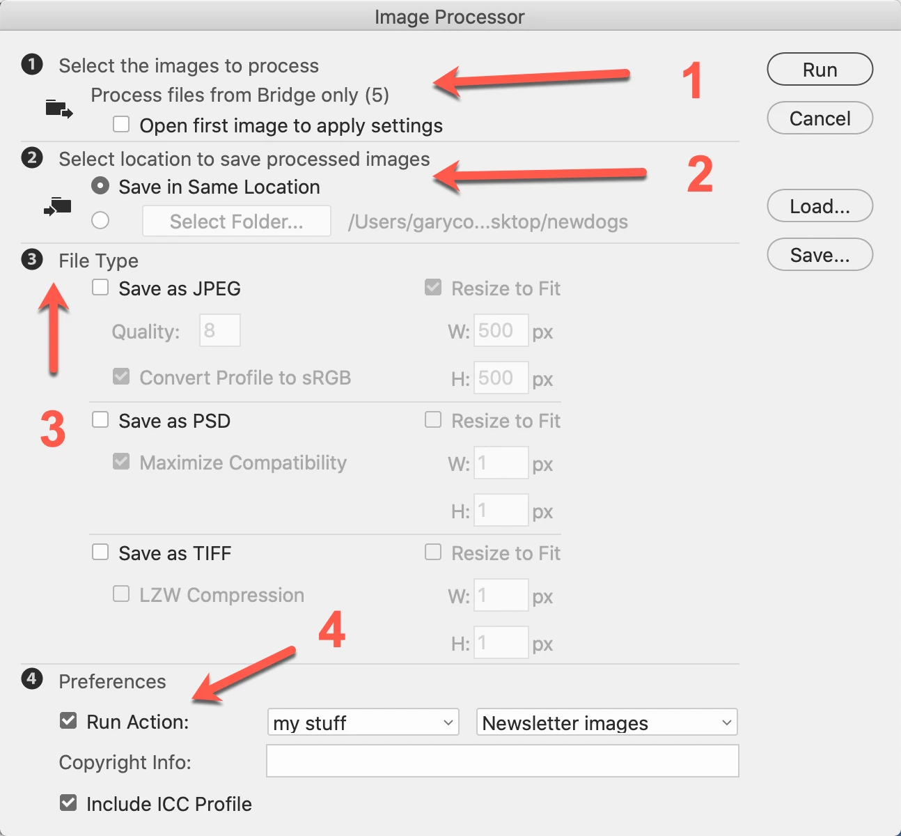 2) Where do you want them saved? Hint, whatever you chose, it will place the results in a folder with the name of the kind of image they are. So if you save as jpg images, you'll have a folder called JPG inside the parent folder that contained the original images. Note: if you do both JPG AND TIF, you will have two folders with that name.