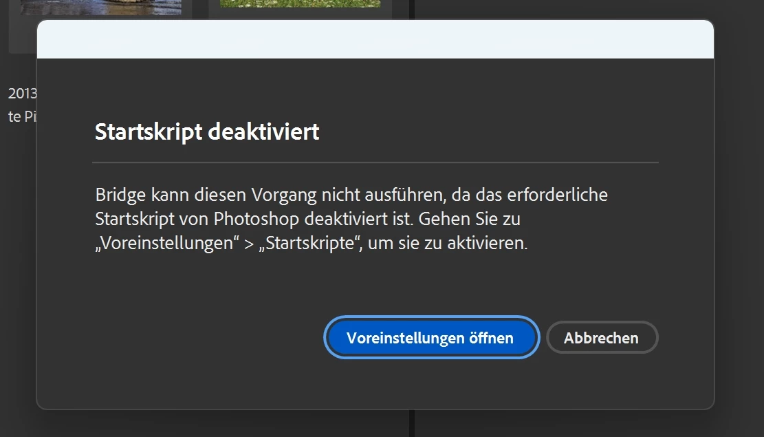 Bridge und Bridge Beta sind installiert auf jeweils 2 Rechnern. Es lassen sich nicht mehr die"Werkzeuge" - "Bildprozessor" aufrufen weil angeblich Startskripte nicht aktiviert sind. Sie sind aber alle aktiviert und der Fehler passiert auf beiden Rechnern. Was ist zu tun?