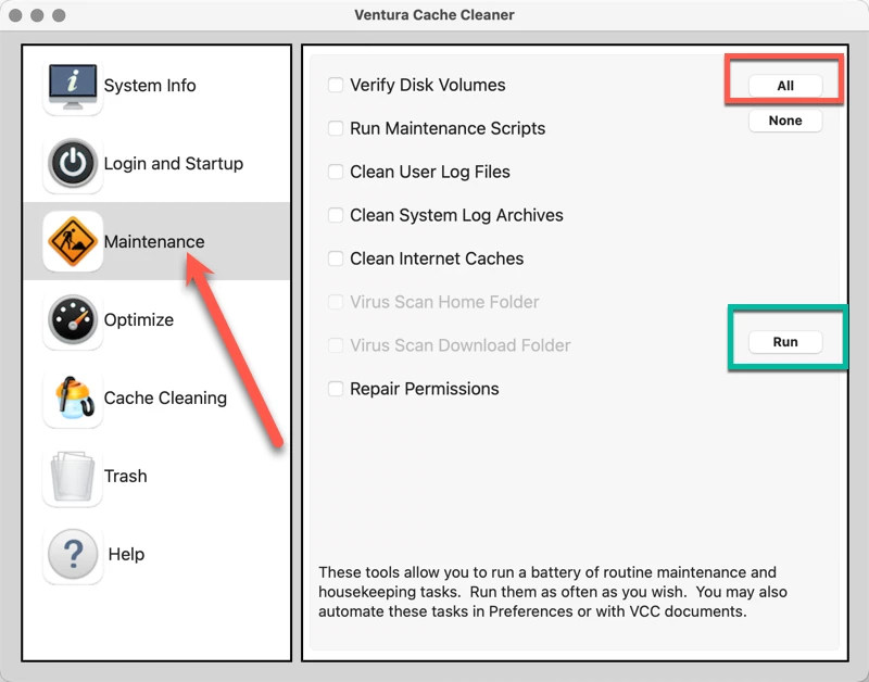 After starting the software, go to the Maintenance tab, click "All," then click "Run."