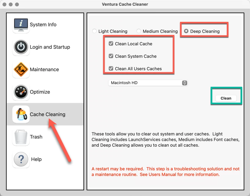 Please go to https://www.northernsoftworks.com/ and download Ventura Cache Cleaner. You can use this for ten days as a free test. (Until you pay for the software and get your user code, you will have to wait about 10 seconds before using the software at full capability.)