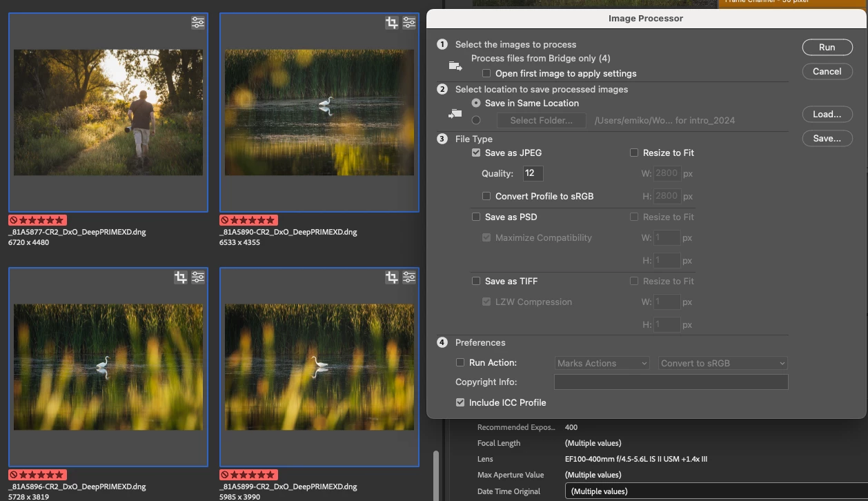 I've triple checked all of my boxes when using image processor. I've used it for many many years and have never experienced this issue. But I'm trying to use Image Processor in Bridge to export my files to either tiff or jpg, and for some reason it's automatically converting them to grayscale in the processing. I have no actions selected to do that. Any guesses? Is this a bug? Images were captured with a Canon 5d MKIV, and sharpened with DXO PRIME. But to be clear, even images not sharpened with DXO PRIME are being converted to grayscale. Attached are screenshot of my Image Processor settings, and the versions of PS and BR I'm running. Help! 🙂