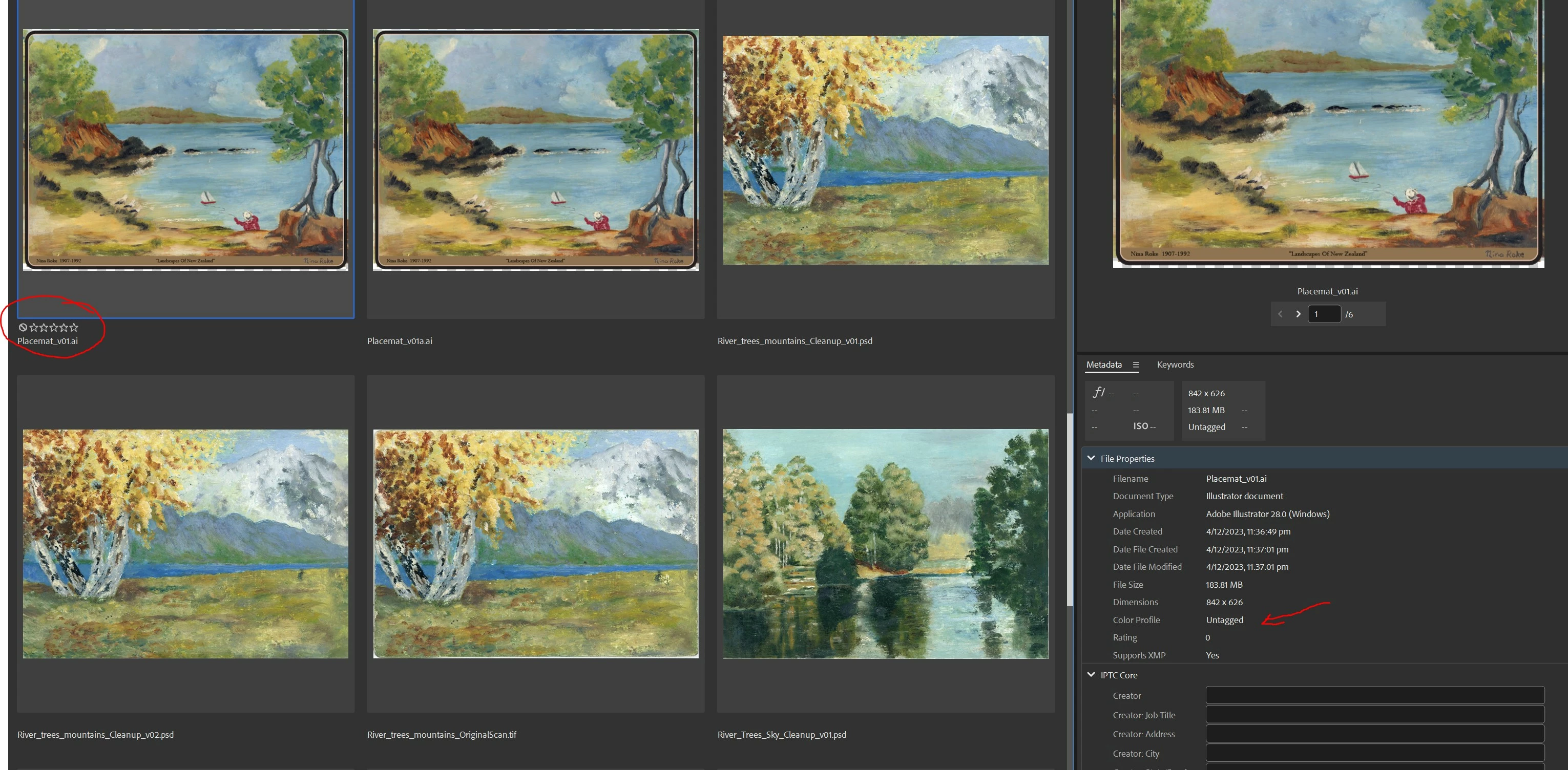 Illustrator and PDF files show the color profile as "untagged"