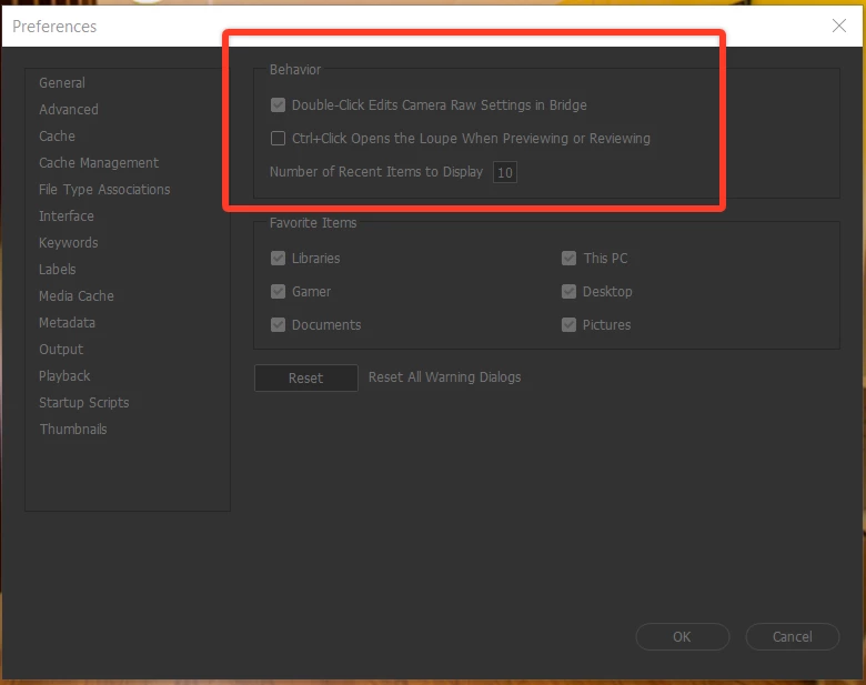 The first checkbox: Double-Click to Edits Camera Raw Settings in Bridge