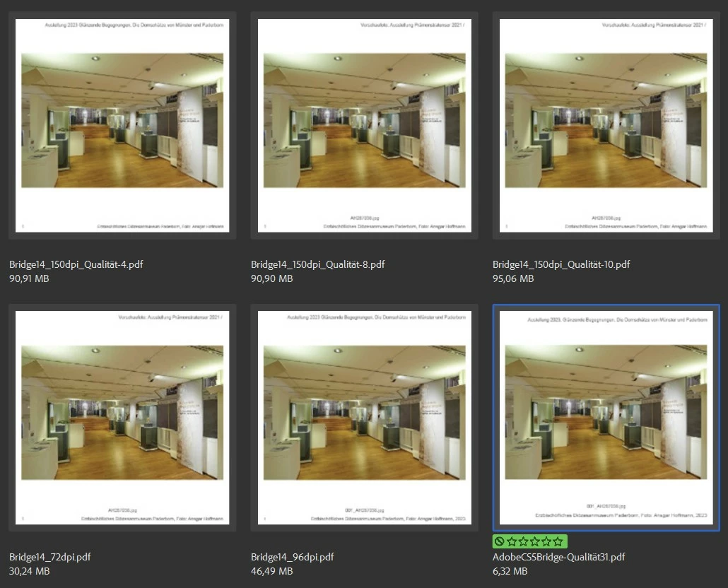 ich bin heute auf ein merkwürdiges Problem gestoßen. Wir arbeiten in unserem Unternehmen mit mehreren MACs und teilweise unterschiedlichen Versionen der Bridge. Wir erstellen für unsere Kunden des öfteren Kontaktbögen mit mehreren Bildern. Für das Erstellen der Kontaktbögen werden der Einfachheit halber die Rohdaten verwendet (Canon .cr2). Heute ist uns aufgefallen, dass die PDFs mit der Bridge 2023 deutlich größer sind als die PDFs mit der Bridge 2022.