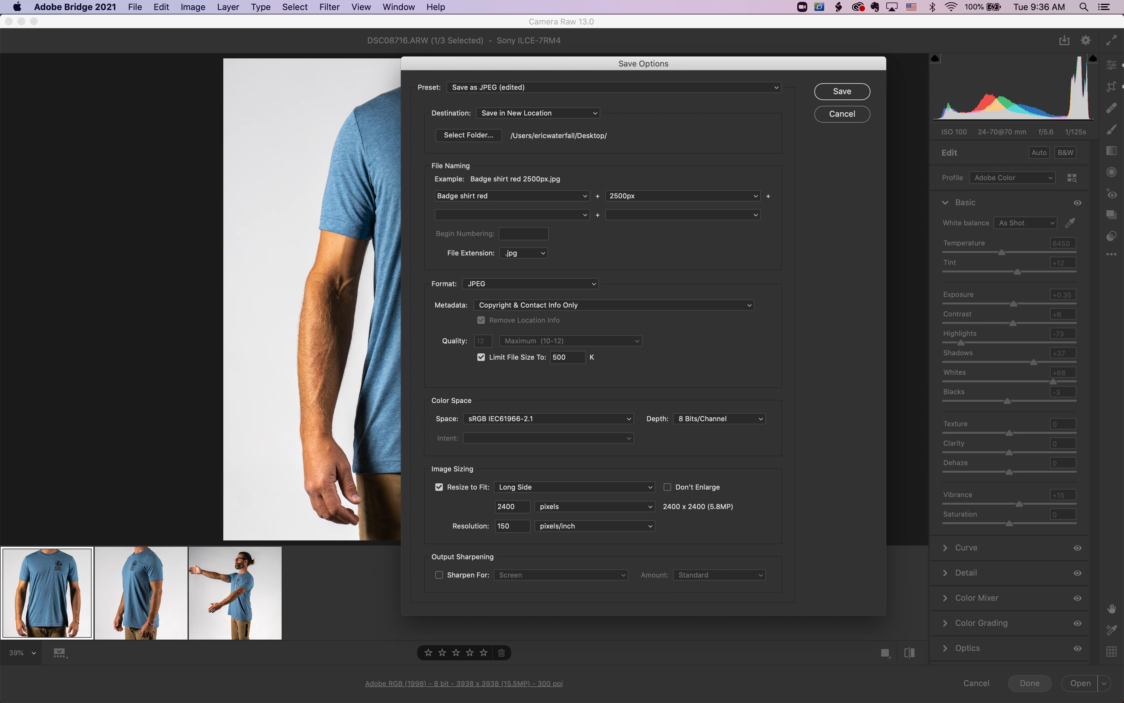 Doing product shots of t-shirts, shooting in Sony ARW (raw). I do most of the edits in Camera Raw within BR, then to remove the back ground I open in PS. Quick selection, erase background, great. Now I need the save function that is within the Camera Raw popup that allows me to save images in jpeg, constraining the longest edge to 2500px, and size to 500kb. I'm saving these images for my website, Squarespace says these are the best settings for that.