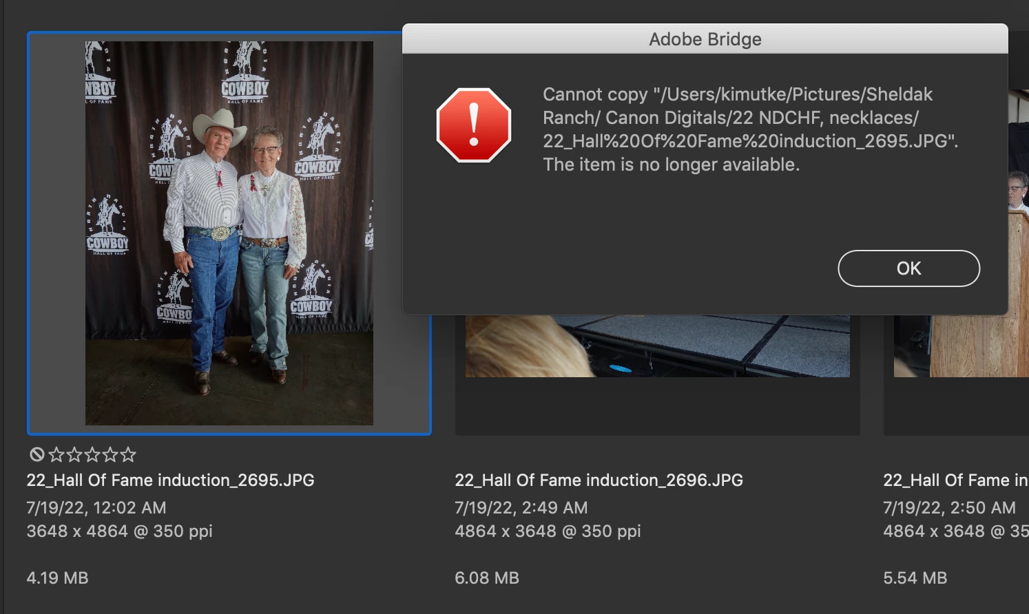 Eight photos in a folder with others give this message when I try to copy them to the desktop to send or for printing in the future (Bridge: "the item is no longer available" and is not in the trash). From our induction to the ND Cowboy Hall Of Fame, so really would like to have them. All photos before and after are accessible.