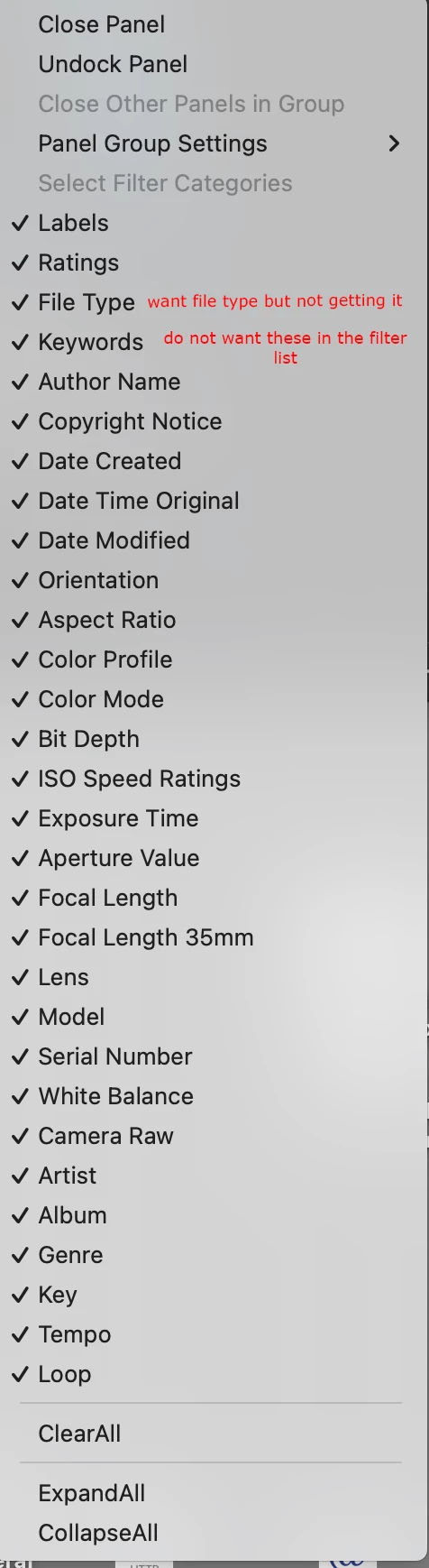 In the filters panel, all stay checked even when i uncheck all I don't want. I want File Types but they won't show.