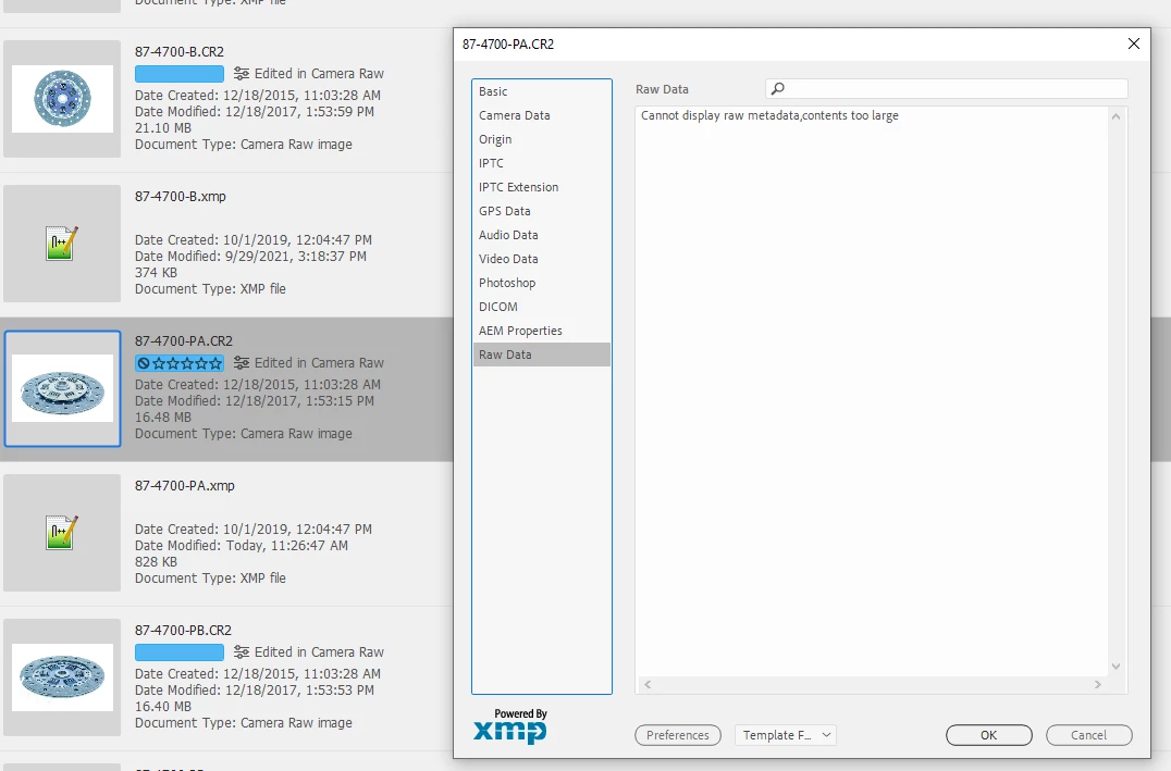 I added a snapshot in ACR to a CR2 file, and now cannot display the Raw Data in the File Info dialog. Note the file size difference for the sidecars, all other XMP files are 374KB. This is identical behavior in Bridge 12 and 13. The file has a mask and the mask data appears both as crs and crss namespace data.