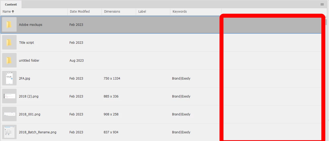 In List view, thumbnail selection has changed slightly from Bridge 12.
