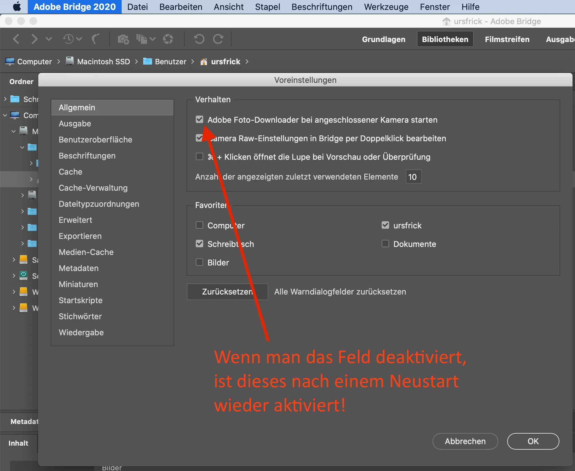Bug/Fehler in den Bridge Voreinstellungen: Photo-Downloader lässt sich nicht deaktivieren