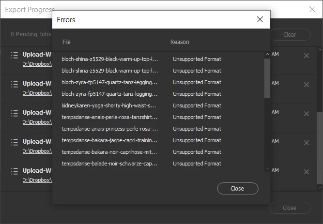 We plan using the Bridge Export panel with various presets for thousands of images. The tool seems to be largely broken, though. I created a preset, chose one of the available output options and set a valid path. Then I dropped a couple of files onto the preset and pressed the "Run" button.