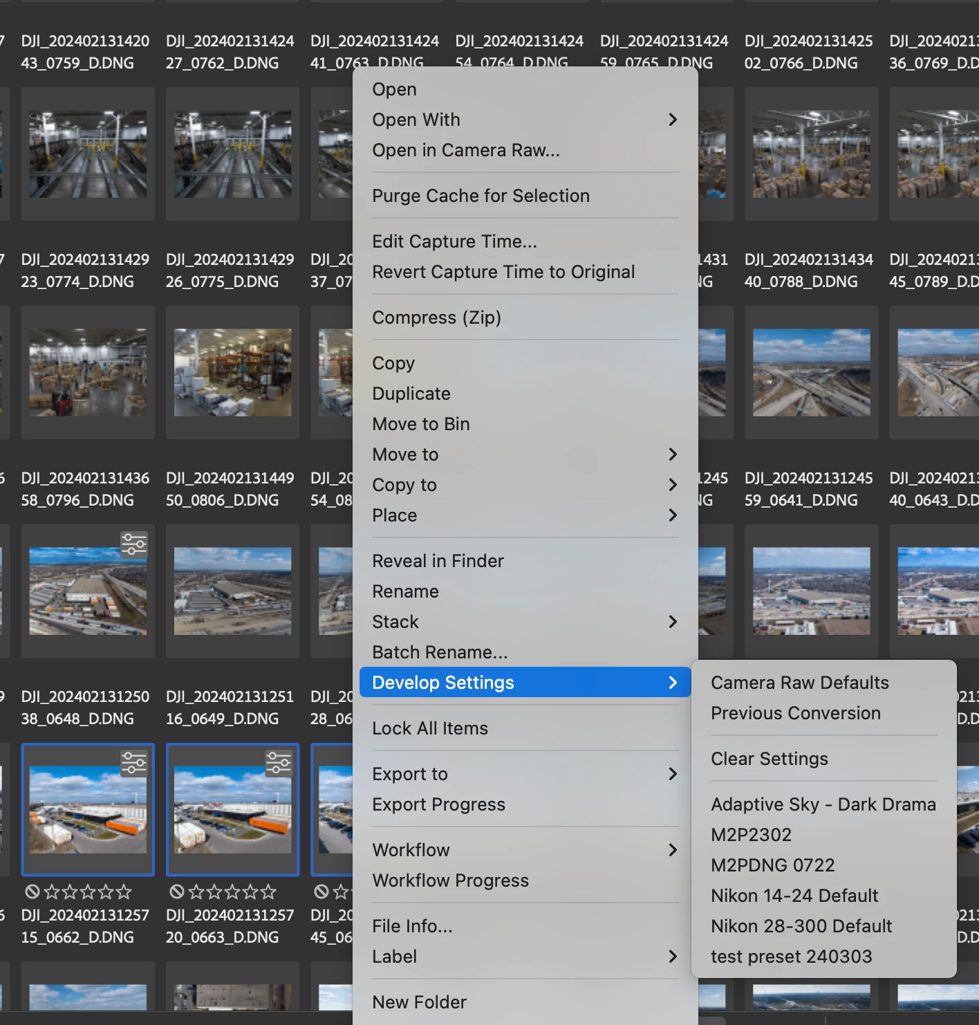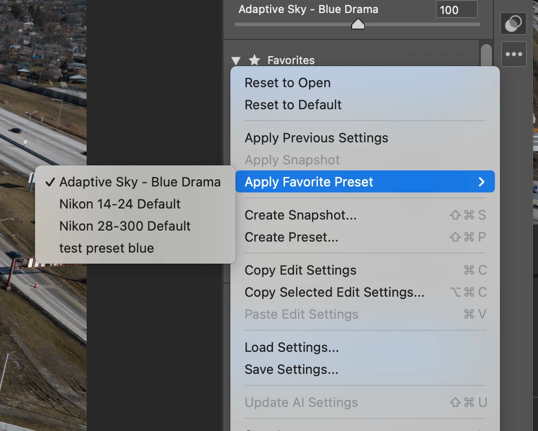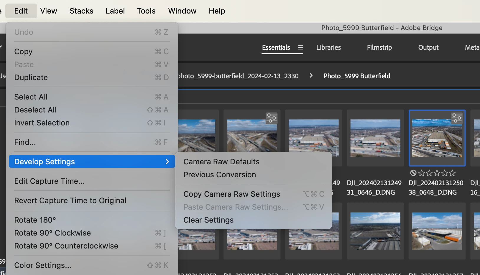 This includes both marking imported User Presets as Favorites and marking Adobe included presets as Favorites in Camera Raw. Note that Favorites are correctly included in the Apply Favorite Preset list on the Camera Raw pop-out panel. But not in Bridge under Edit -> Develop Settings.