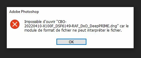 3. in ACR click 'open' to edit in Photoshop: error message 'impossible d'ouvrir some-image.dng car le module de format de fichier ne peut interpréter le fichier'