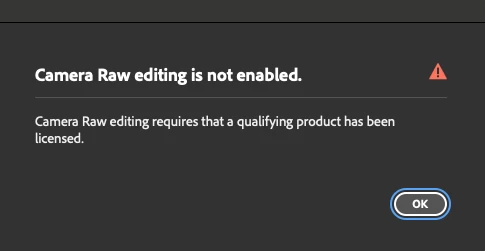 "Camera Raw editing is not enabled." with a ⚠️ sign, and "Camera Raw editing requires that a qualifying product has been licensed."