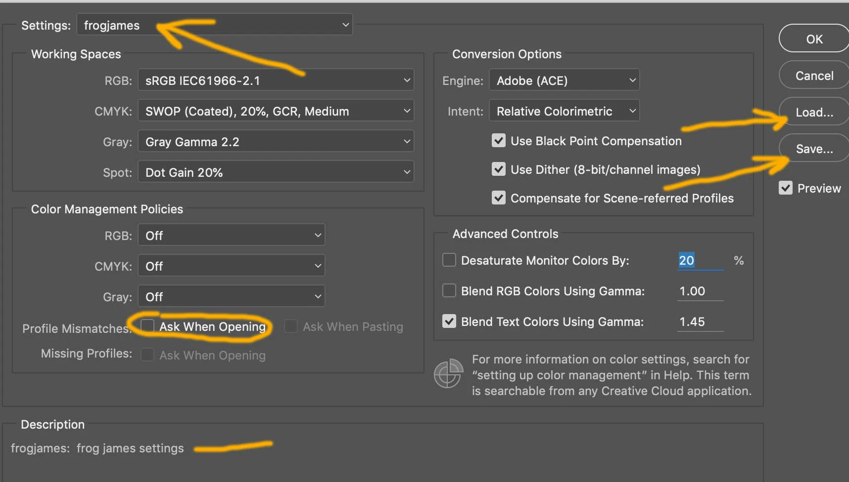 1. If you use an Adobe supplied Color Settings preset, go to next step, otherwise use Photoshop Color Settings, to create your desired color settings, and then Save a named Preset.