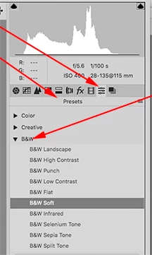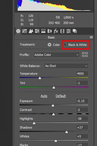 Various grayscale conversions are available in the Presets section, after which you may use Basic or Curves, for example, for further adjustment. You may also click on the Black & White button in the Basic drop-down menu.