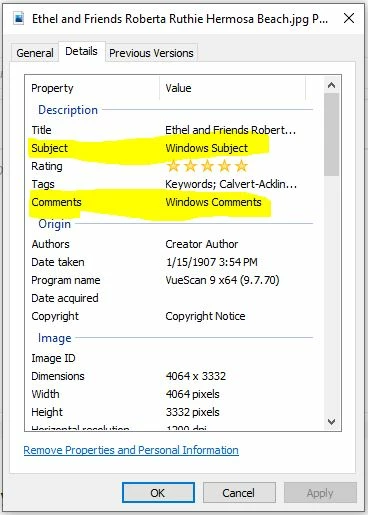 Right clicking a JPG file in Windows displays the attached metadata properties. I can find all of them for interactive editing in Adobe Bridge, except for the two highlighted in yellow, "Subject" and "Comments". How to I find these two fields in Bridge, what are they called, and how to I interactively edit them in Bridge?