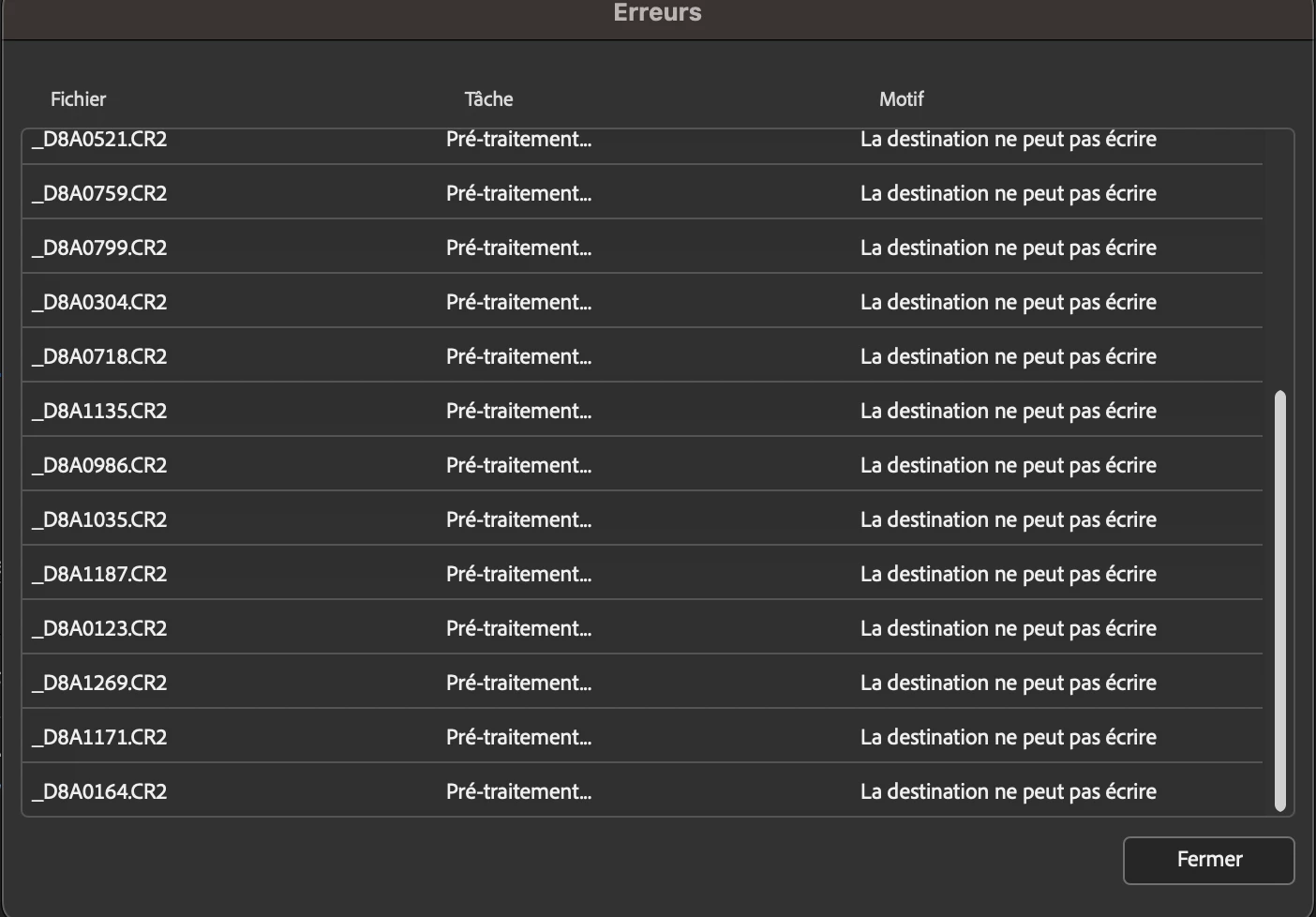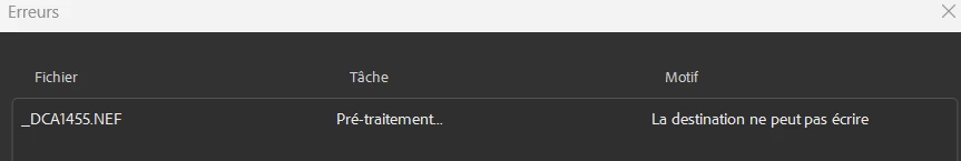 lorsque j'execute un work flow j'ai systematiquement une erreur. motif : la destination ne peux pas écrire alors qu'une exportation simple fonctionne.