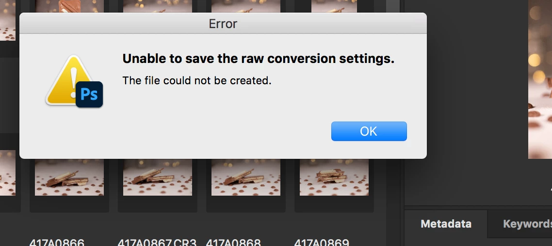 Error Message: Unable to save the raw conversion settings. The file could not be created.