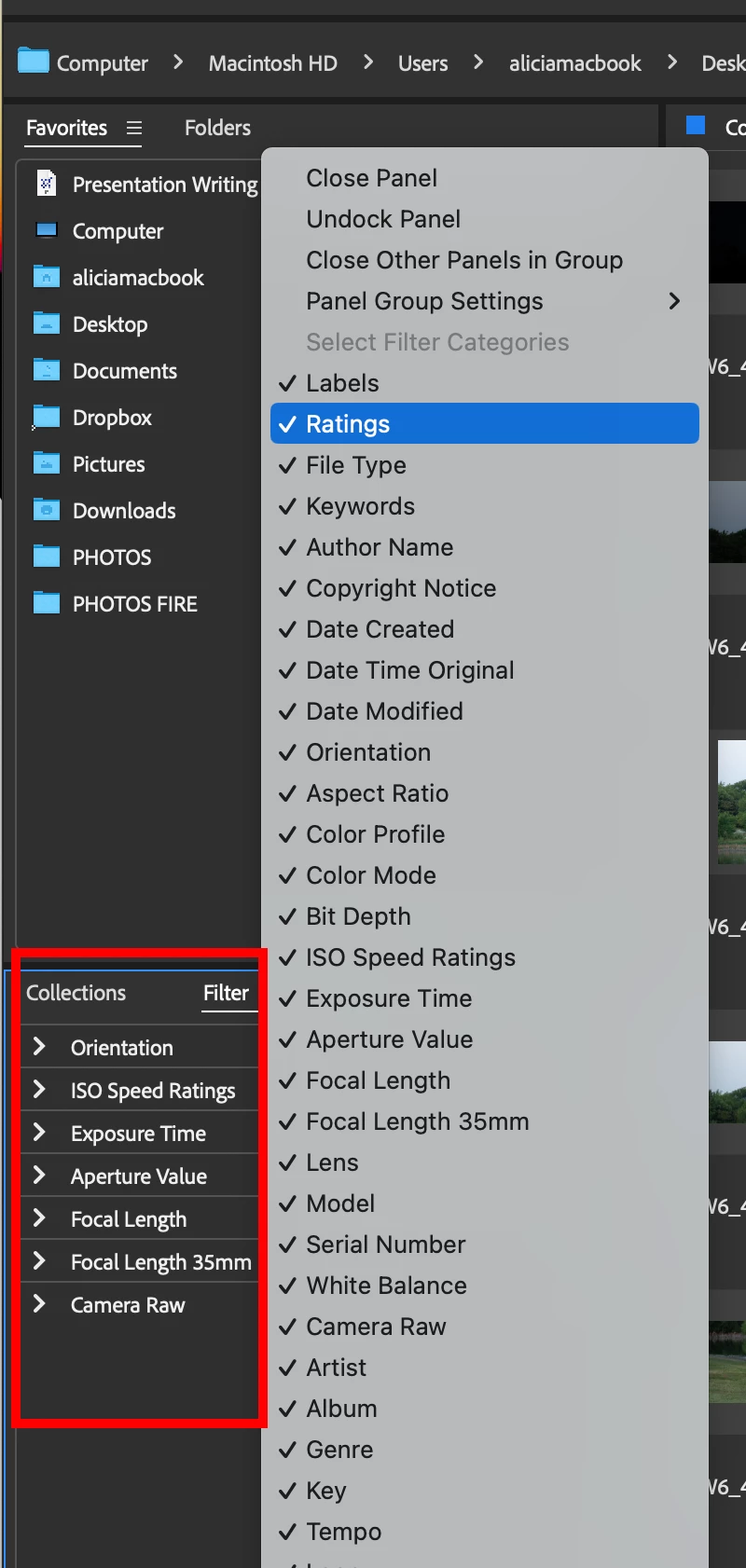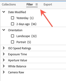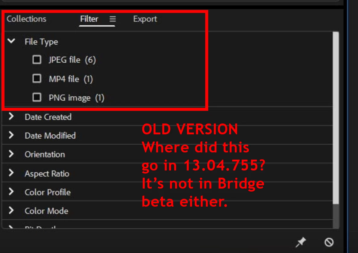In the older verison of Bridge, you could filter files by file type, by rating, etc. But in 13.04.755 and also in Bridge Beta, this option is gone. When I click on the filters fly out panel, it shows all filter options checked, but only a handful show up (first screenshot). What I really want to do is filter by rating and file type, like I used to (see second screenshot). When I uncheck and check the option, it does nothing (doesn't matter if all images are slected or not).