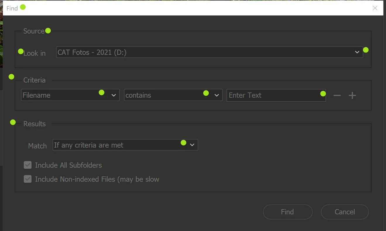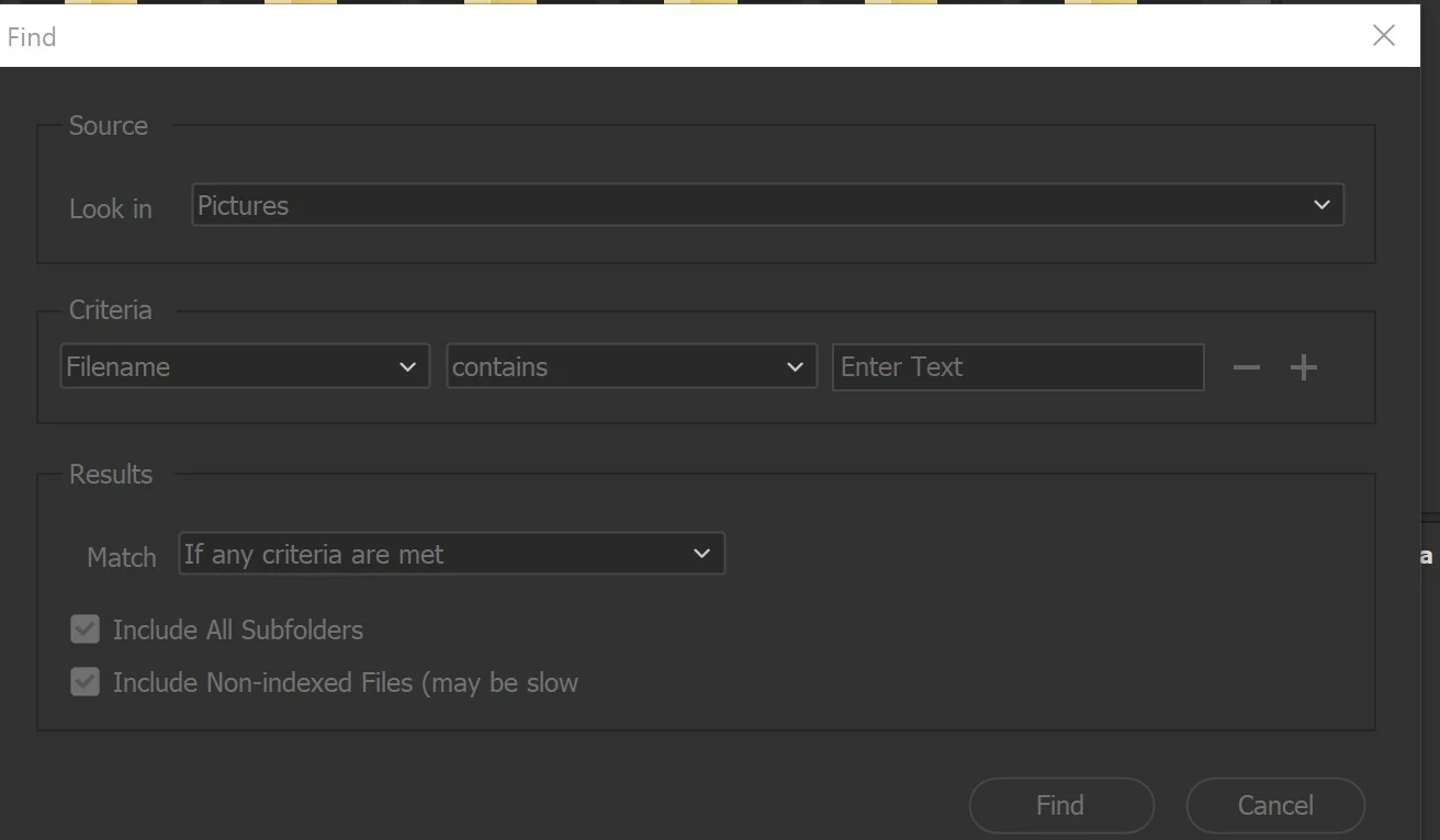 Upon opening the find command the drop down functions in the opened Find window will not work. The "Look In" the "Criteria" and the "Match" will not change. I have reset and downloaded Bridge. Windows 10