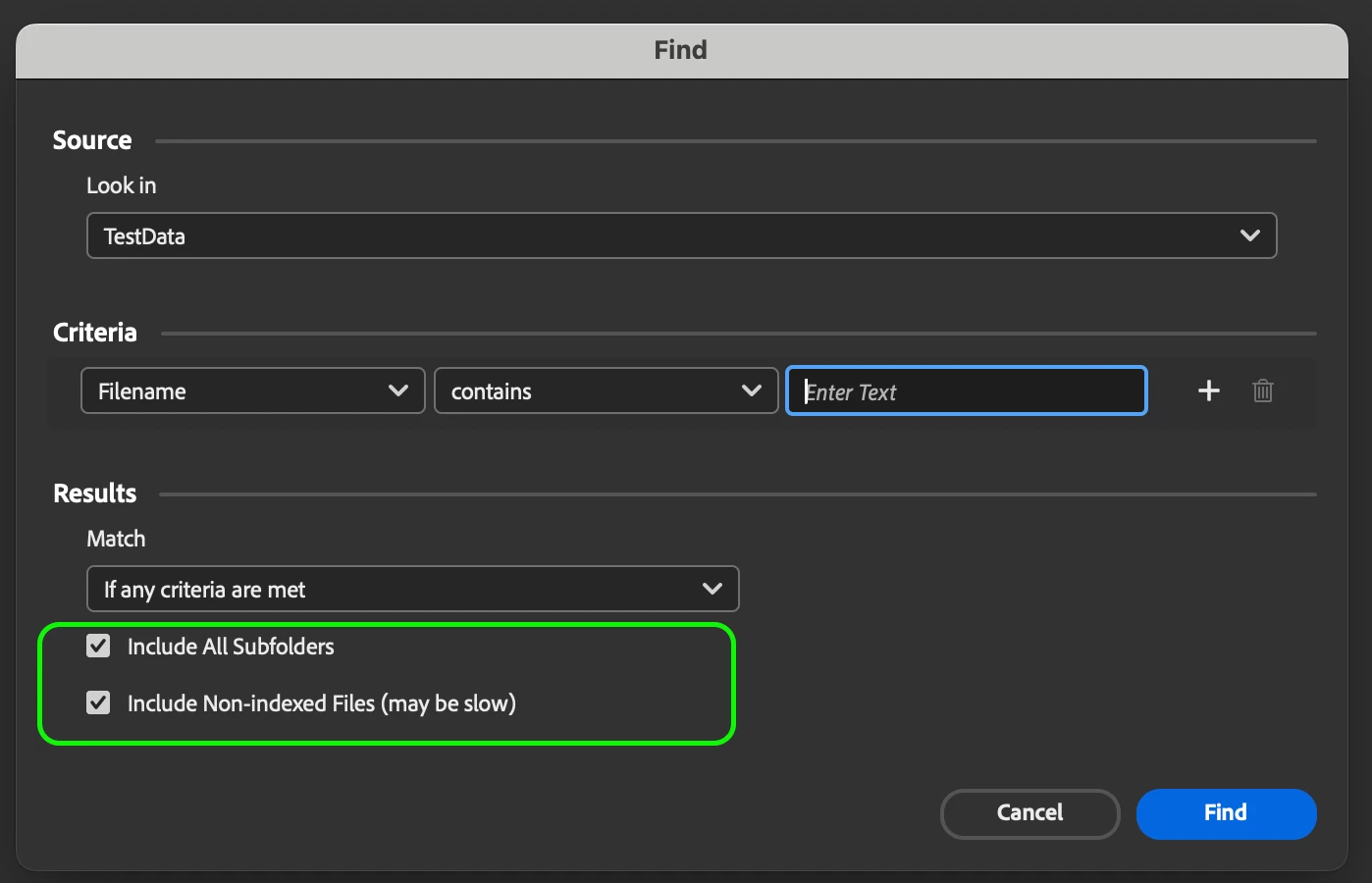 Advanced search with options checked for checking in subfolders "should" search all of the subfolders inside the parameters.