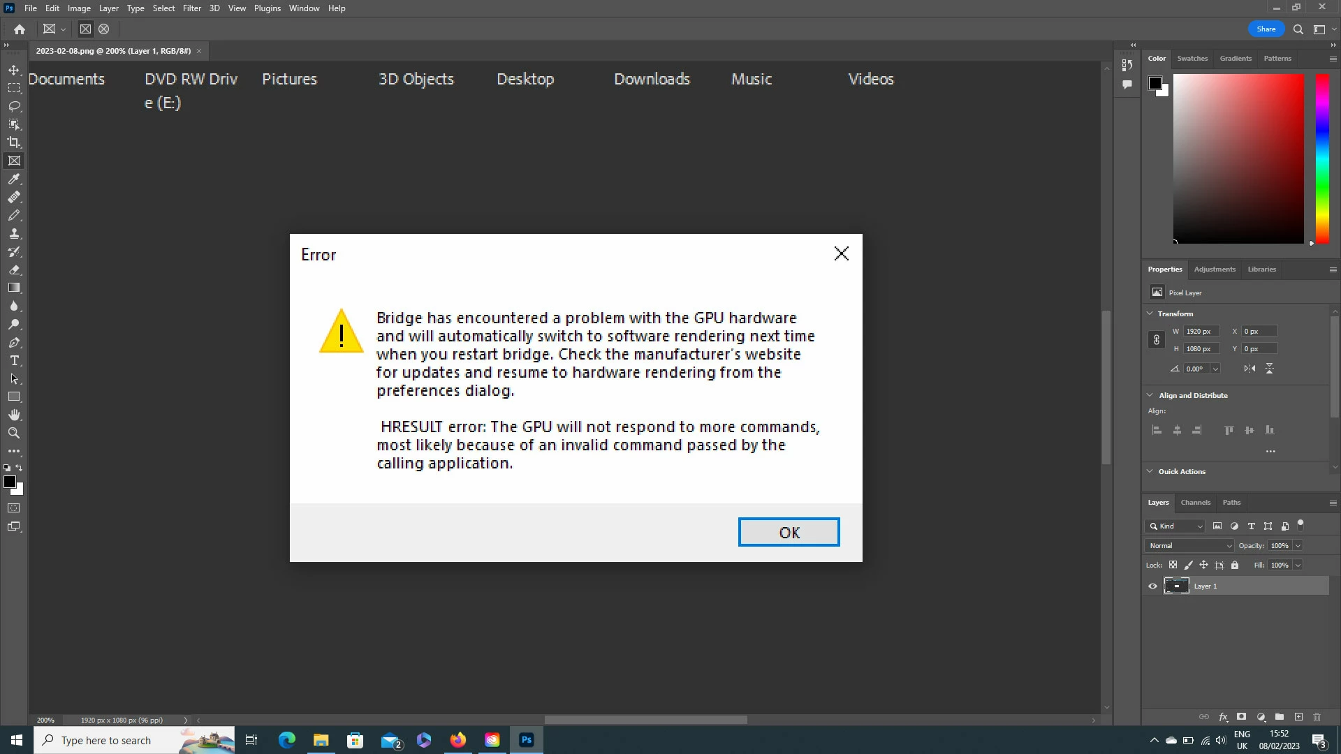 I use a Windows 10 laptop and today received this error message (screenshot enclosed) when I opened Adobe Bridge. I updated the display driver, but got the message again. Can you advise please?