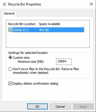 Please go the recycle bin properties and check if Don't move files to the Recycle Bin. Remove files immediately when deleted is select or not. Please select Custom Size and click on OK.