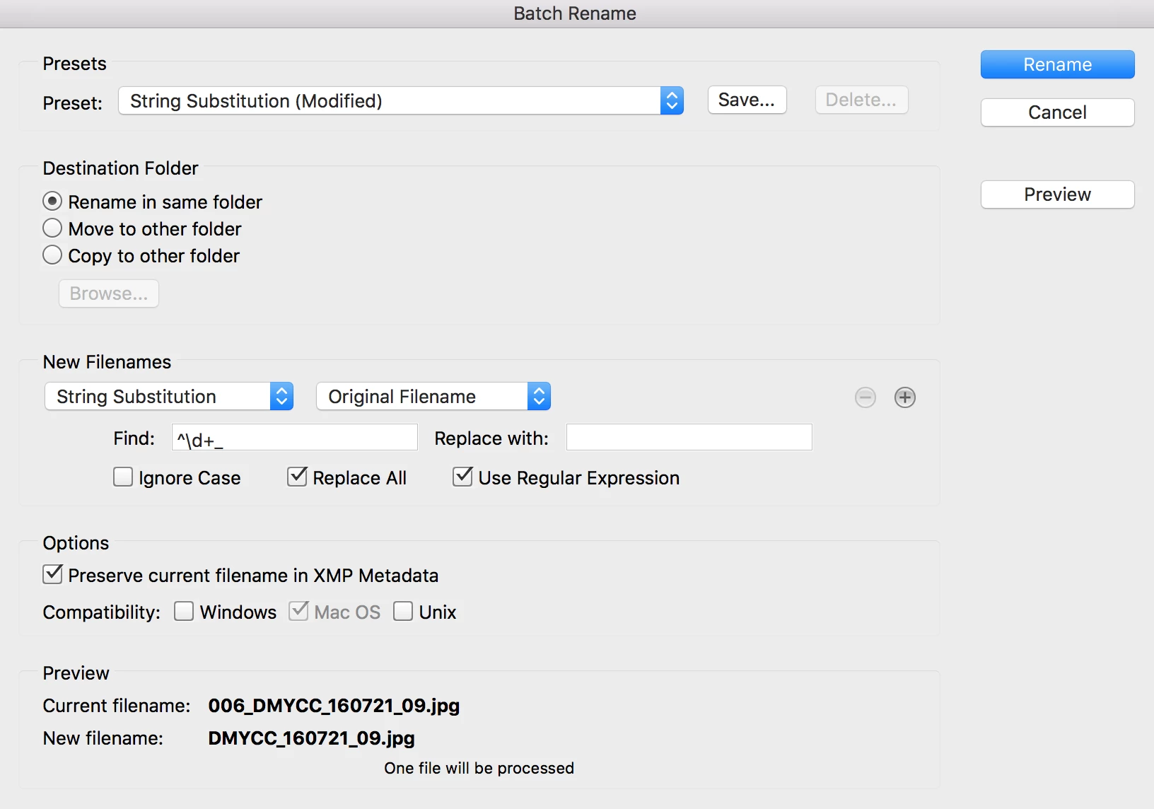 How do I remove a number sequence using batch rename