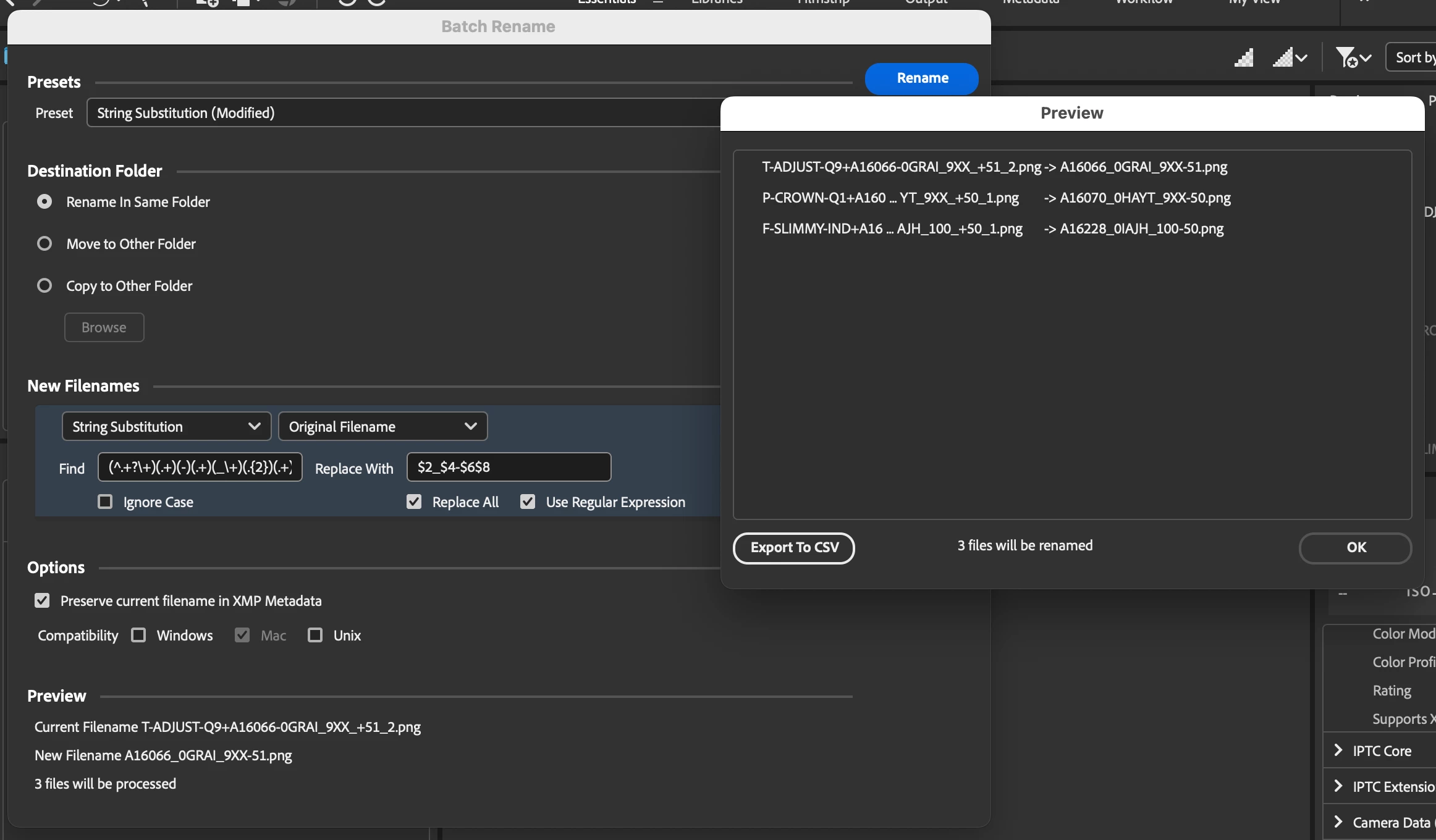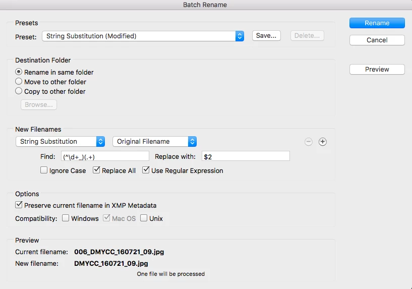 The reason I have these filenames in the first place is that I have run the photoshop script "layer comps to files", and this adds a number sequence prefix. I have tried to alter the script following various instructions I've found from trawling the internet (this one included How do you remove the number sequence when exporting layer comps to files? CS6. Windows 8.) but without any luck. So now I'm resorting to batch renaming in Bridge.