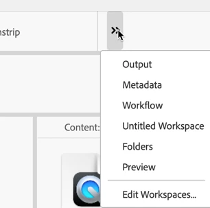 Everything above where it says "OverflowMenu" will show if Bridge's window is pulled out far enough. Otherwise they will show by mousing-down on the chevrons. But also note the "Do Not Show:" option. If you have any Workspaces that are built into Bridge but you'd never use them, you can dump them into that cubbie hole.